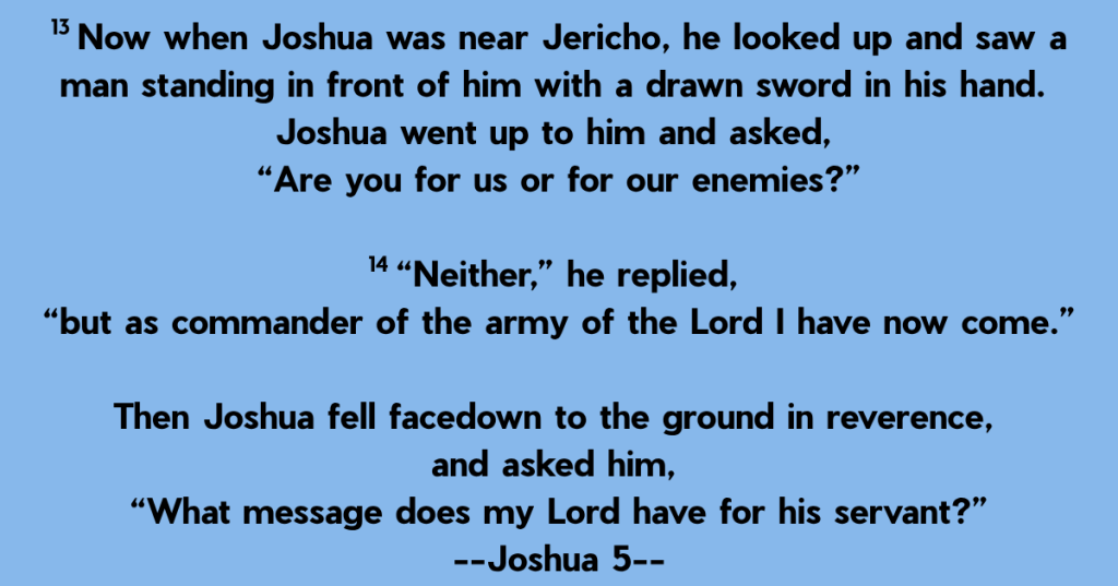 We know he looks up and sees this man there. Joshua looks at him and asks a simple question. “Are you for us or for them?” Seems reasonable. I mean, the man isn’t one of the tribe of Israel, and he could be a spy or a messenger from Jericho, maybe an ambassador for another king offering aid. No idea.